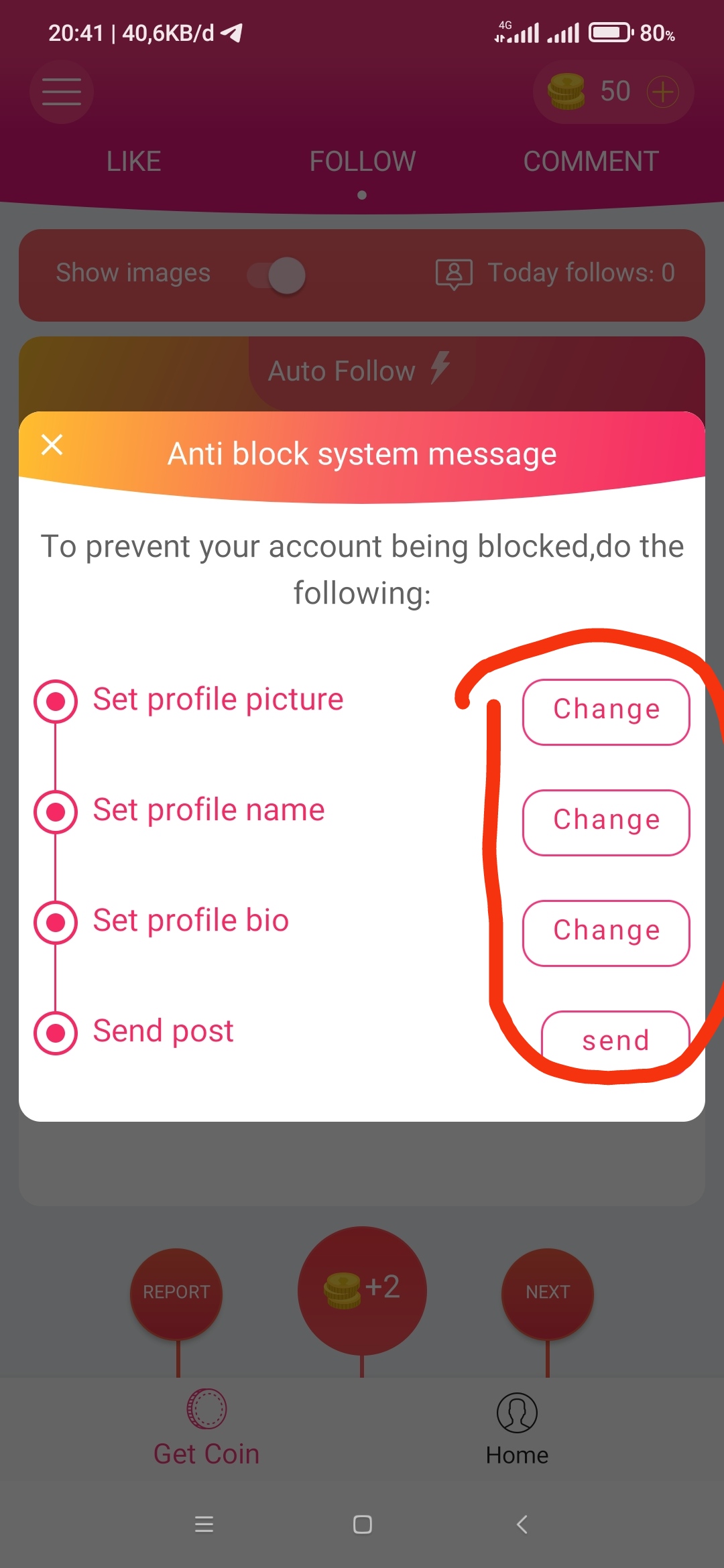 -jika sudah login akan muncul sebuah tulisan "anti block system message" nah itu untuk mencegah block terhadap akun ig tumbal kamu jika akun ig tumbal kamu kena block tenang saja kalian bisa buat lagi kok dan efek block ini tidak kena ke akun utama kalian yaa jadi jangan khawatir, untuk pesan ini jangan kalian silang tetapi kalian ikuti perintah nya karena disitu perintah nya disuruh ganti profile picture,profil name ,profil bio,send post jadi itu cukup mudah kalian tinggal klik change di sebelah kanan saja